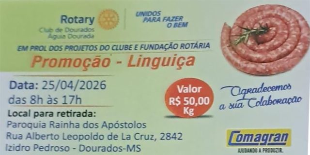 A promoção da linguiça será no dia 25 de abril, das 8h às 11h, com o objetivo de arrecadar recursos que ajudarão a manter e ampliar o trabalho social realizado pelos rotarianos em Dourados e região. O clube atua em diversas frentes, promovendo ações voltadas à educação, saúde, assistência social e apoio a famílias que mais precisam.