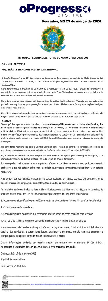 Início Editais REQUISIÇÃO DE SERVIDORES PARA 18ª ZONA ELEITORAL – TRE MS – 25-03-26 REQUISIÇÃO DE SERVIDORES PARA 18ª ZONA ELEITORAL – TRE MS – 25-03-26 25 de março de 2026